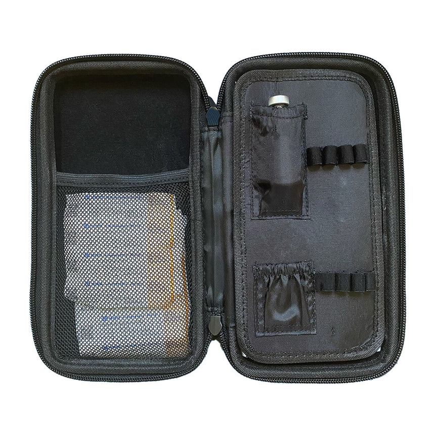 Designed with user flexibility in mind, this shot kit offers compartments that accommodate various bottle sizes without compromising on security. The adaptable T bottle compartment effortlessly adjusts to fit both smaller and larger bottles, ensuring a snug fit. Simply stretch the compartment slightly for larger bottles, and rest assured that it's built to endure without tearing. With this versatile organization, frustration-free travel with your shot supplies becomes a reality.