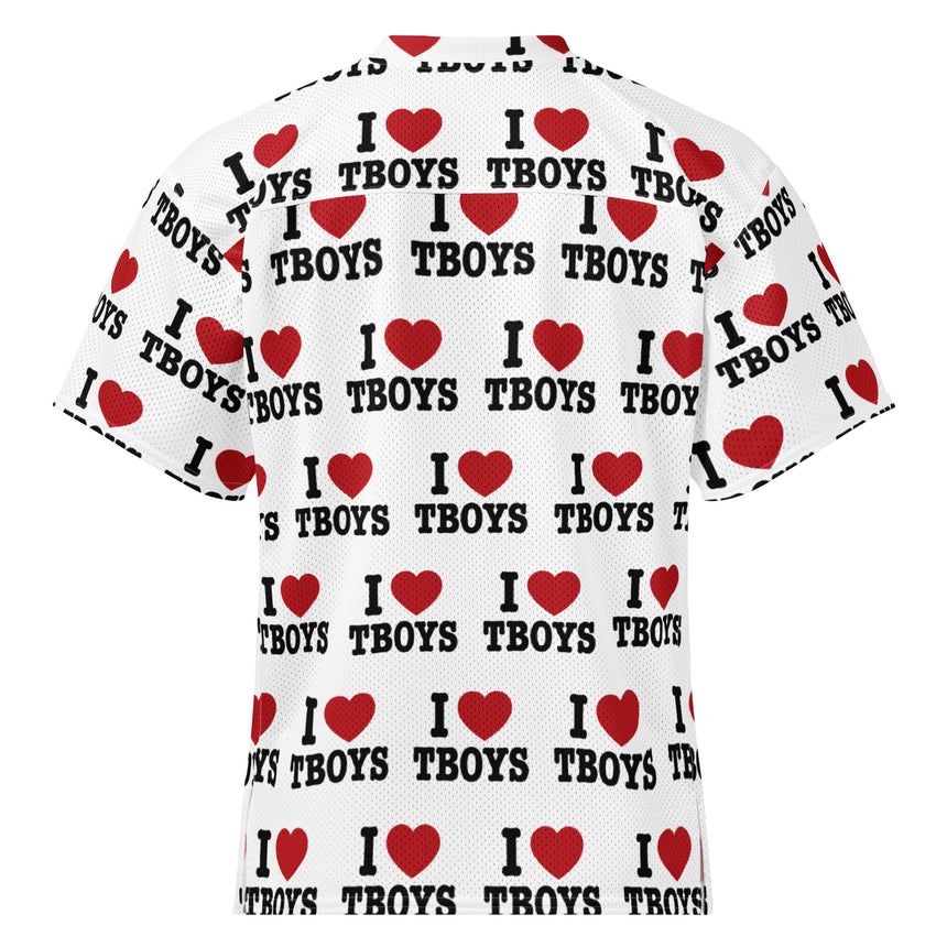 $46.00Take your game-day look to the next level with the I Heart TBOYS Mesh Football Jersey. Designed for transmasc, nonbinary, T4T folks and our admirers, this lightweight, breathable jersey is perfect for everyday wear, Pride events, wrestling nights, or just living your authentic vibe.