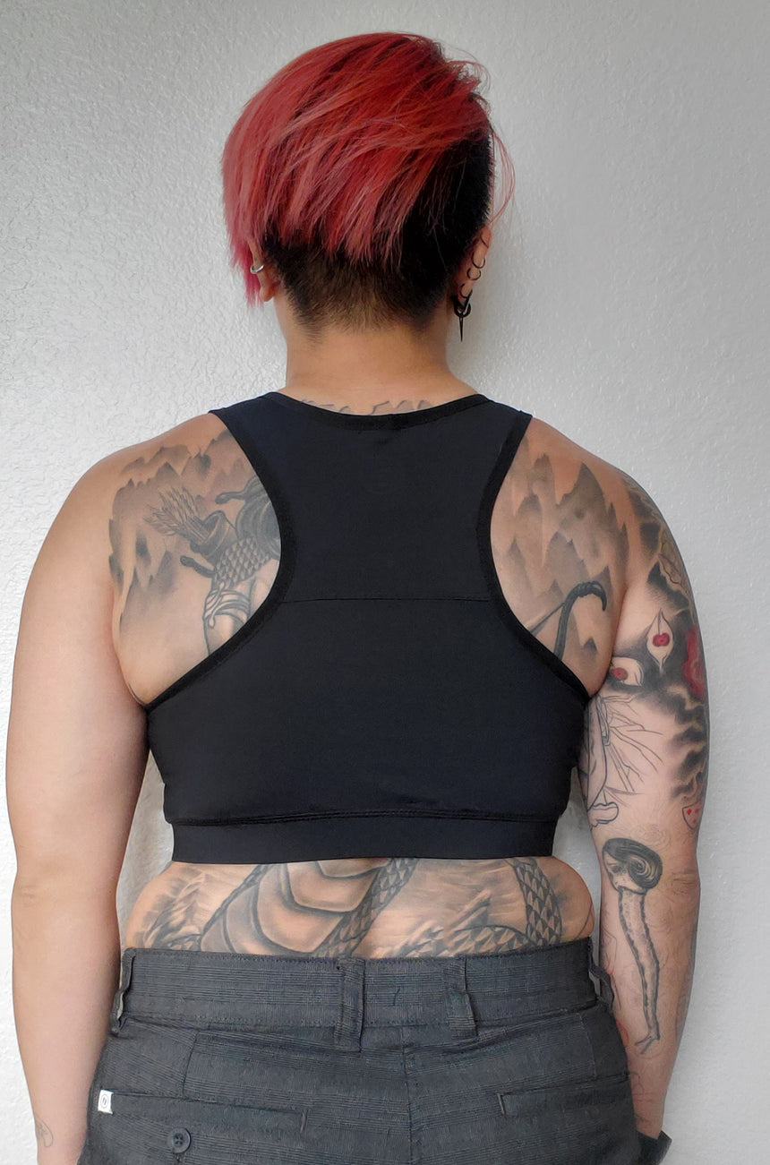Style: Pullover racerback chest binder with double-panel compression front