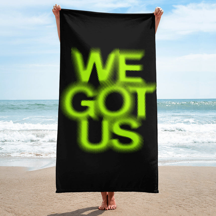 Wrap yourself in comfort and community with this plush black beach towel featuring WE GOT US in bold neon green. Soft enough to dry you off, strong enough to make a statement—it’s a tribute to the unbreakable bonds of trans and queer folks who always have each other’s backs.