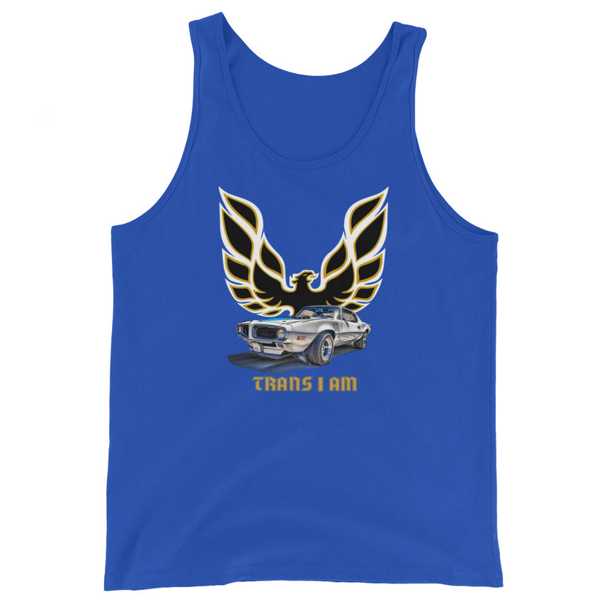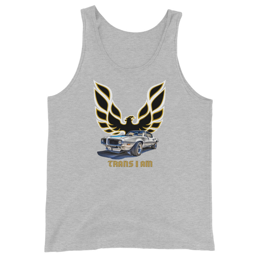 This bold tank top takes the iconic car logo and flips the script with unapologetic trans pride. Inspired by the mythic Phoenix -reborn stronger every time it burns, “TRANS I AM” reminds us that our journeys are powerful, personal, and unstoppable.