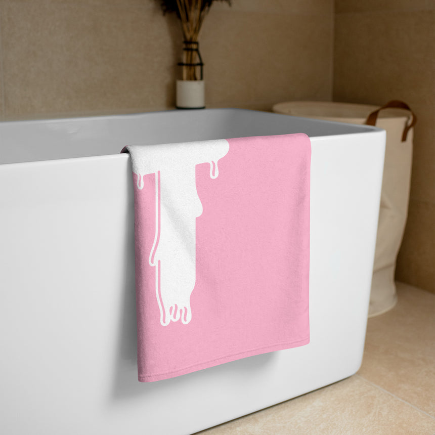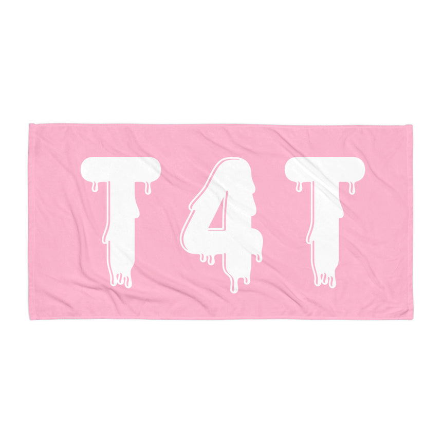 Hit the beach, pool, picnic, or hang it in your bathroom in ultimate trans pride with this bold pink beach towel featuring dripping T4T letters. Eye-catching and unapologetic, it's perfect for soaking up the sun while repping love, community and connection.