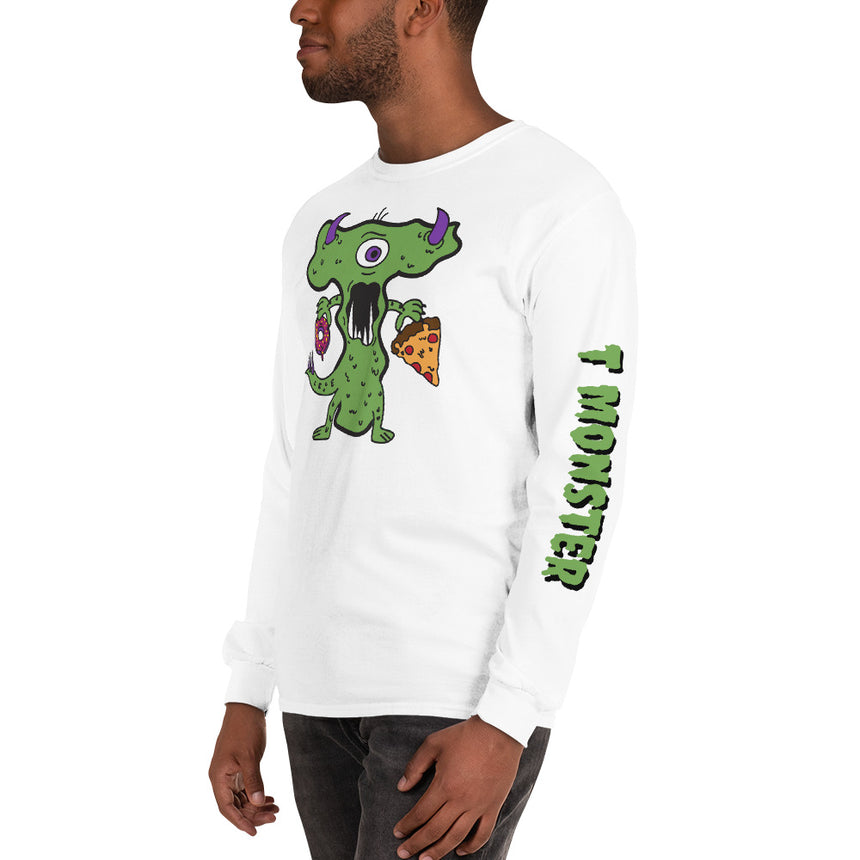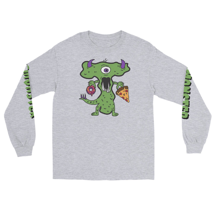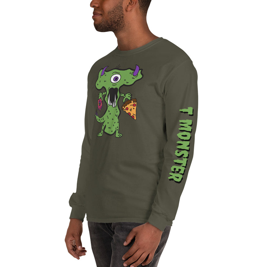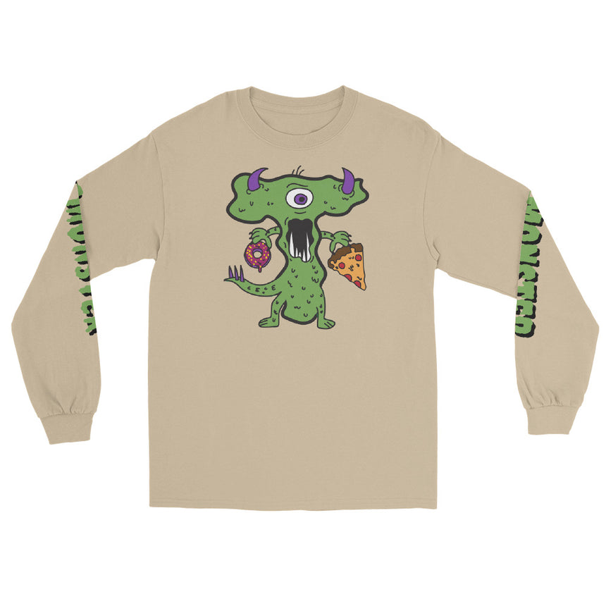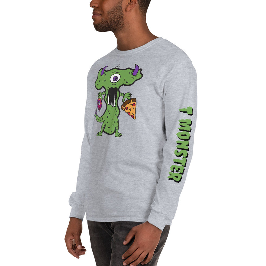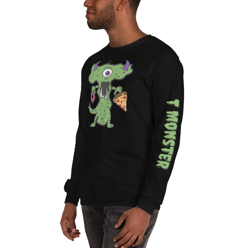 Why... Am... I... So... HUNGRY???? If you've ever found yourself raiding the fridge at 2 AM since starting T, this tee is for you. Featuring T Monster lettering down both sleeves and a lovable T character chomping on pizza and donuts, this graphic captures the post shot munchies life.